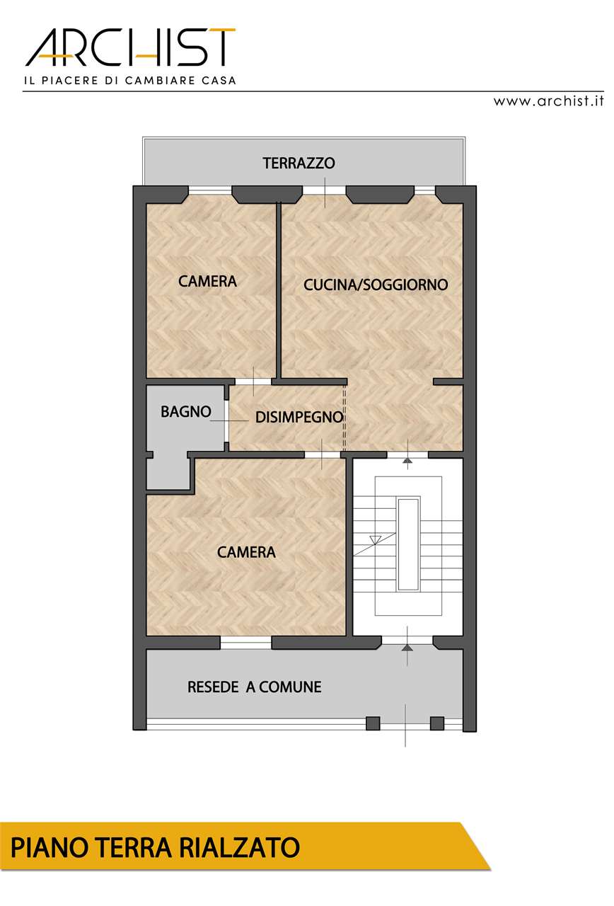La palazzina è oggetto di una ristrutturazione completa, che garantirà impianti nuovi e finiture moderne, con la possibilità di personalizzare gli interni secondo i gusti. L'appartamento si sviluppa al piano terra rialzato ed è composto da un ingresso che si apre sulla zona giorno con angolo cottura, da cui si accede al terrazzo tergale, perfetto per momenti di relax all’aperto; un comodo disimpegno conduce alla camera matrimoniale, alla camerina e al bagno con doccia.