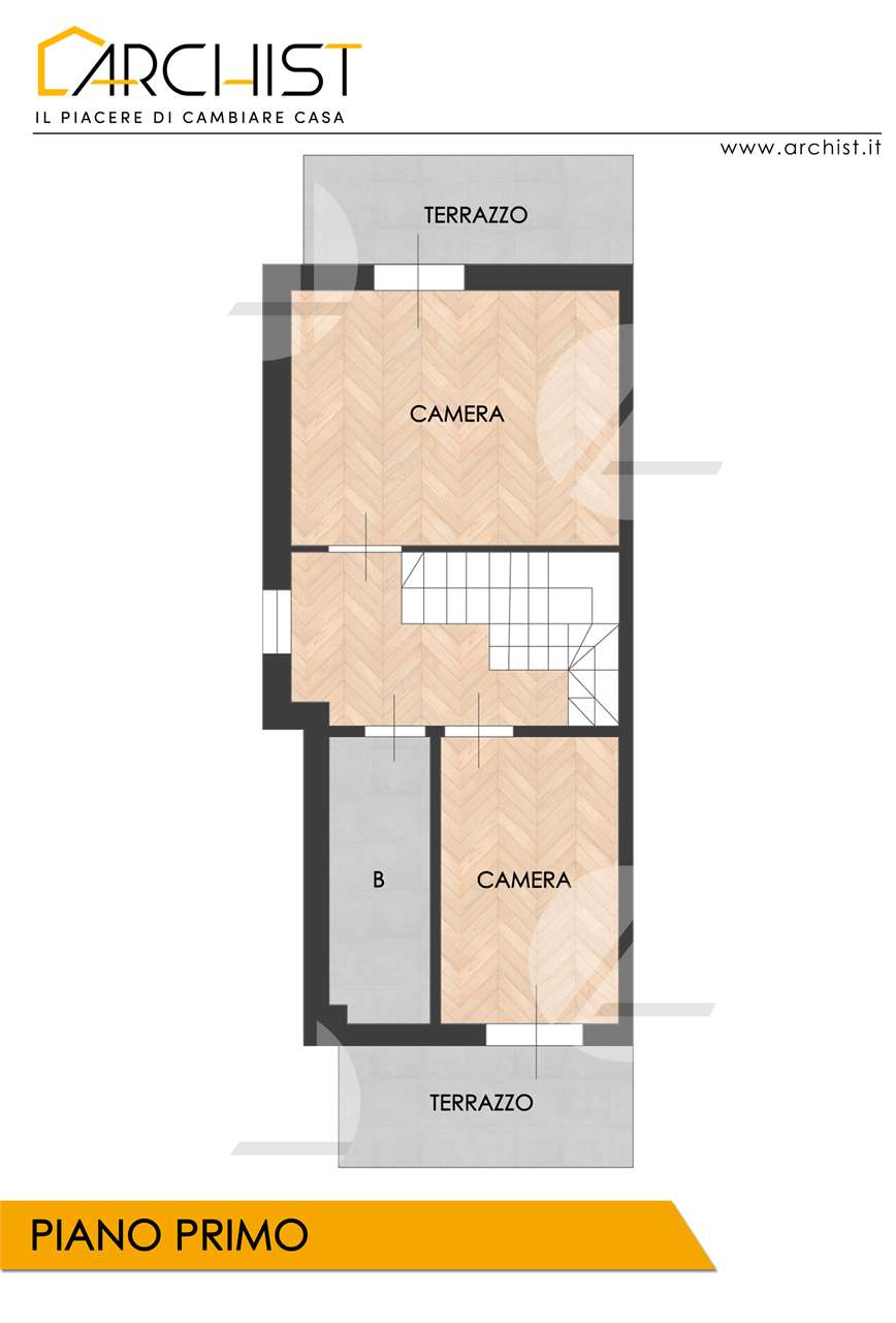 ? Piano Primo: zona notte composta da camera matrimoniale e camera singola, entrambe con terrazzo, oltre a bagno finestrato con doccia.