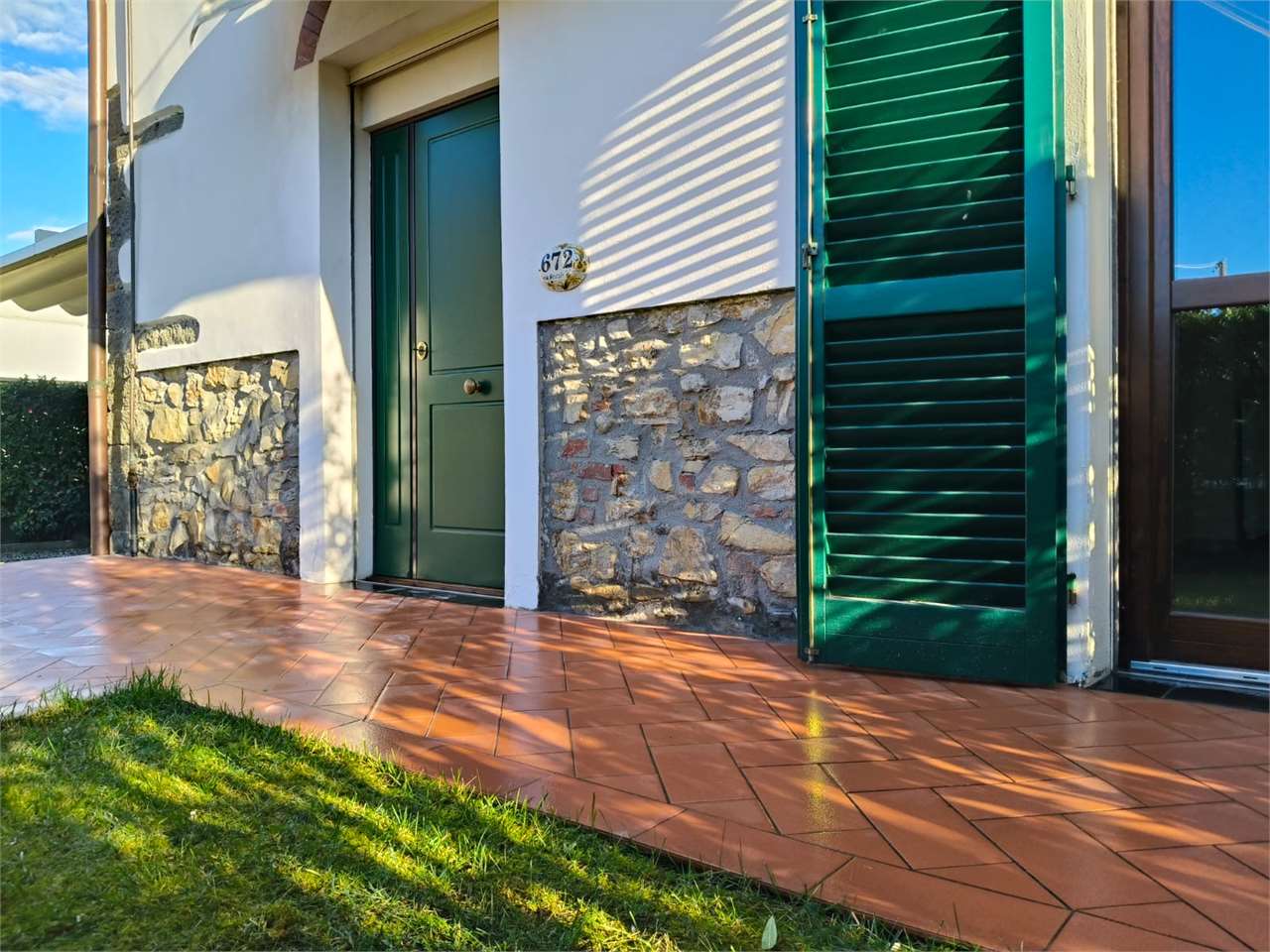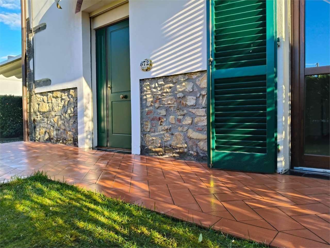 All’interno, l’abitazione è composta da una luminosissima zona giorno con angolo cottura affacciato sul giardino e su una pergola elegante, ideale per pranzi e cene all’aperto. Il giardino, completamente recintato e arricchito da una siepe perimetrale, garantisce ottima privacy.