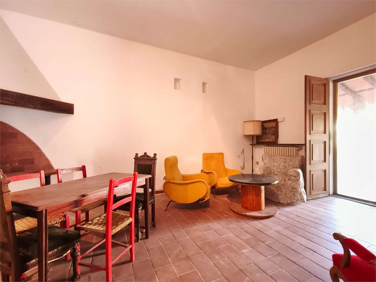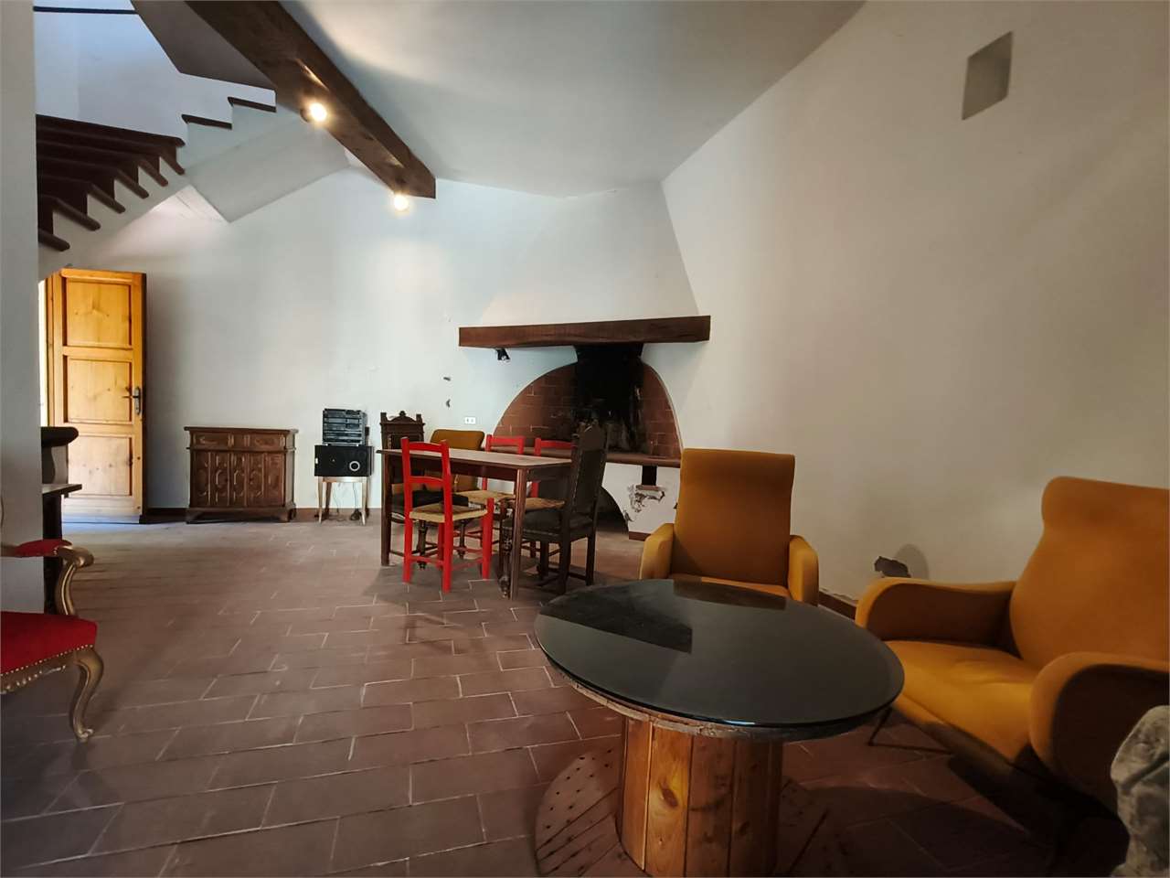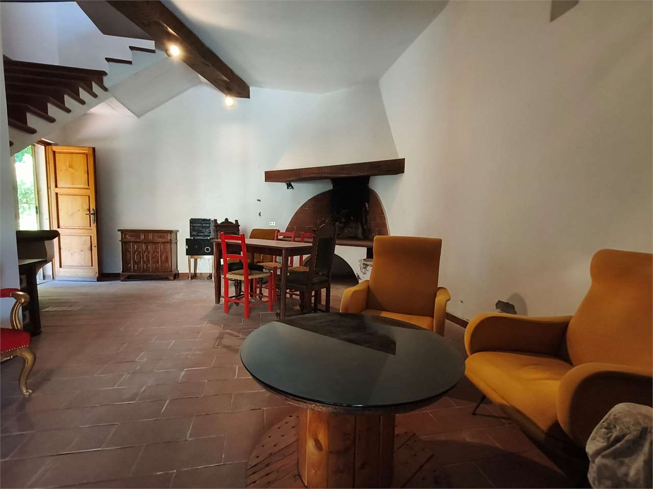 L'appartamento si sviluppa al primo piano ed è indipendentemente accessibile attraverso ampia sala posta al piano terra e dall'antistante portico in muratura.