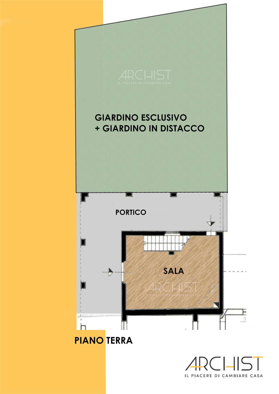 Sala, cucina abitabile, 4 camere e bagno, oltre portico eslcusivo di oltre 40 mq., giardino privato adiacente e ulteriore giardino posto in distacco ma a soli due passi dall'abitazione.
